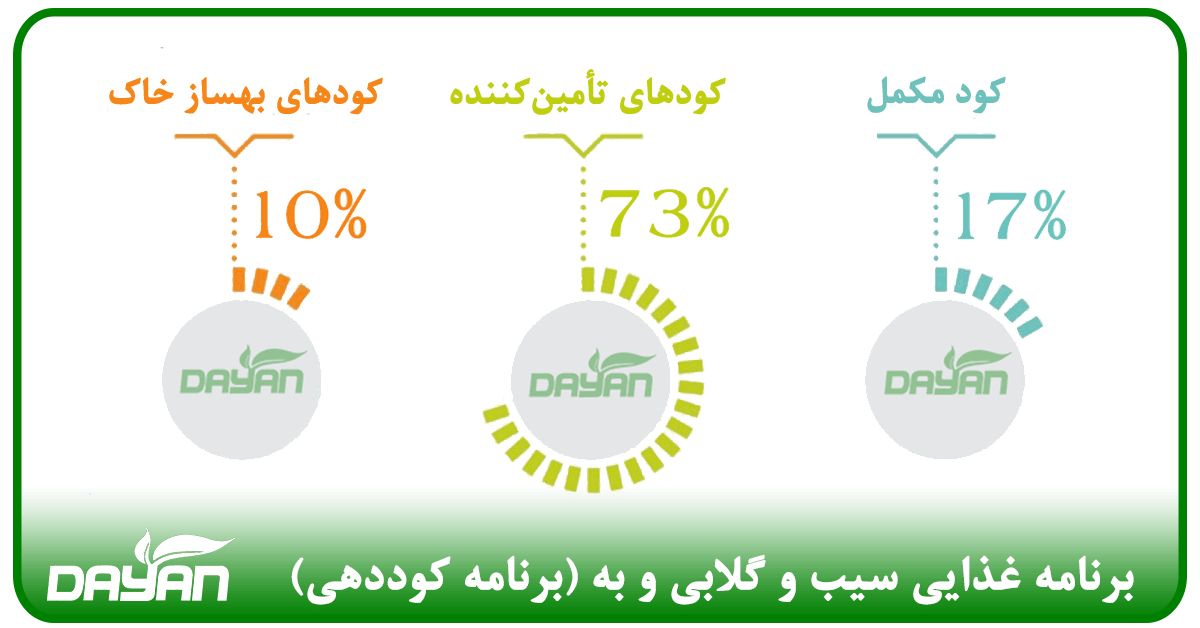 در ارتباط با تقسیمبندی کودها از جنبه اثرگذاری در بالا توضیح داده شد. در برنامه غذایی سیب و گلابی دایان درصد مناسبی از انواع کودهای تأمینکننده، مکمل و بهساز خاک با توجه به نیاز درخت سیب و گلابی وجود دارد. چراکه هر کدام از این کودها در جایگاه خود موثر و مناسب است ولی مصرف بیش از حد هر کدام از این کودها مشکلات و یا کمبودهایی را ایجاد خواهد کرد.
