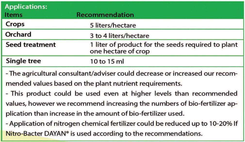 Microorganisms used in this product besides nitrogen fixation, produce useful phytohormones, enzymes, organic acids, and chelating agents. Application of nitrogen chemical fertilizer could be reduced up to 20-30% If DAYAN Nitro-Bacter® is used according to the recommendations.