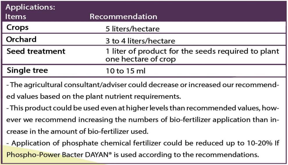 Phosphorus is one of the main nutrient elements for plant growth and development. The major part of the phosphorus in the soil is inaccessible (insoluble) to the plant and the amount of available (soluble) phosphorus is negligible in agricultural soils. Nowadays, climate changes, inappropriate soil tillage operations, and continuous exposure to pesticides, herbicides, and chemical fertilizers all together result in soil structure destruction, soil organic matter, and nutrient losses. The soil microbial population has been severely influenced. Phospho Bacter Dayan® contains highly active microorganisms which could potentially solubilize the inaccessible phosphorous sources, and increase the bioavailability of phosphorous and other elements for plants. The microorganisms used in the product produce organic acids, phytohormones, and enzymes which these microbial metabolites increase the yield of plants, regulate soil pH, and enhance the bioavailability of other micro-elements. This product is exclusively formulated and contains highly active and multi-acting species of Pseudomonas sp. and Bacillus sp. With high phosphate solubilizing activity. This product is developed to partially provide the phosphorous requirement of plants through solubilizing insoluble phosphorus sources present in the soil.